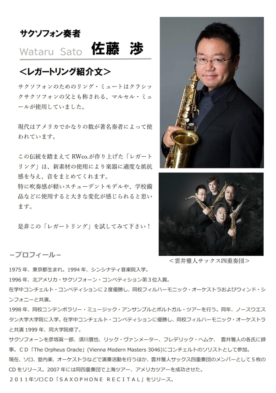 この伝統を踏まえてRWco.が作り上げた「レガートリング」は、新素材の使用により楽器に適度な抵抗感を与え、音をまとめる効果があります。
